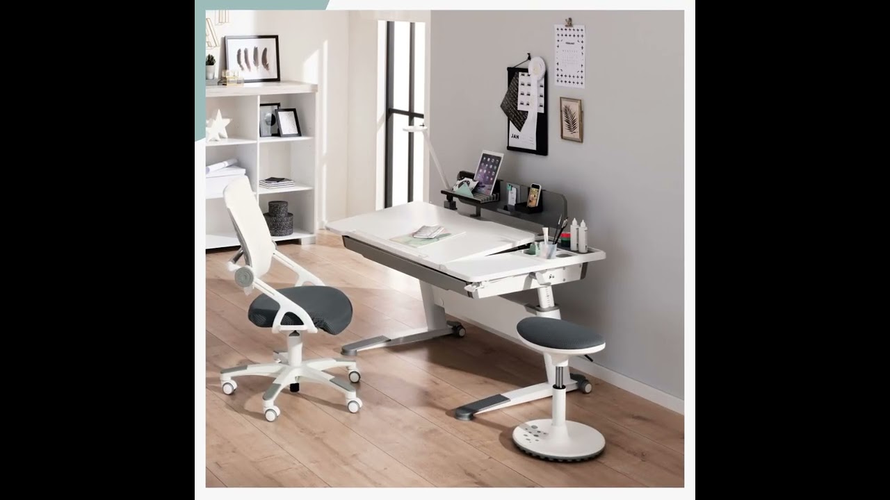 Technik mit all ihren Möglichkeiten, das ist der Kinder- und Jugendschreibtisch Jaro. Er setzt einen neuen Maßstab in puncto Ergonomie, Funktion und Design. Den Tisch gibt´s in zwei Varianten, für Rechts- oder Linkshänder. Für Linkshänder ist die fest stehende L-förmige Platte links platziert, für Rechtshänder auf der rechten Seite. Der feste Teil ist mit einem Stiftebecher und einer 3-teiligen Utensilienschale ausgestattet, die dank Kabeldurchlass zugleich eine praktische Ladenstation ist. Außerdem ist die Tischplatte in Birke-Nachbildung, trendigem Schiefergrau oder klassischem Weiß erhältlich. Ein Teil der Tischplatte liegt durch zwei Gasdruckfedern und einem leichten Hebeldruck fast schwebend in geeigneter Position. Das Gestell ist vor Schmutz geschützt durch die angebrachten silbergrauen Protektoren. Zwei Rollen sorgen außerdem dafür, dass der Kinderschreibtisch leicht zu verschieben ist. Mit diesem Arbeitsplatz machen die Hausaufgaben Spaß.